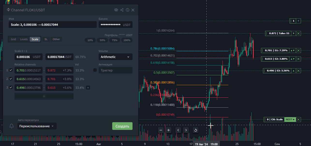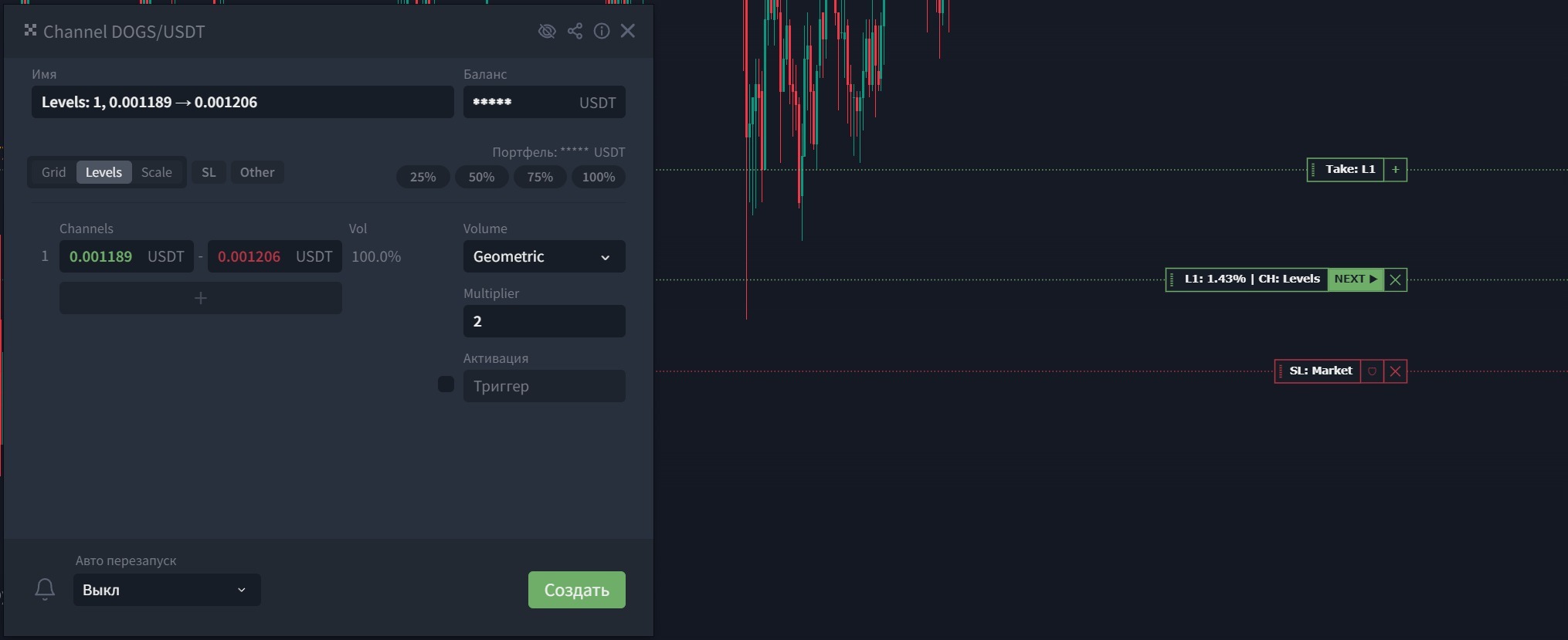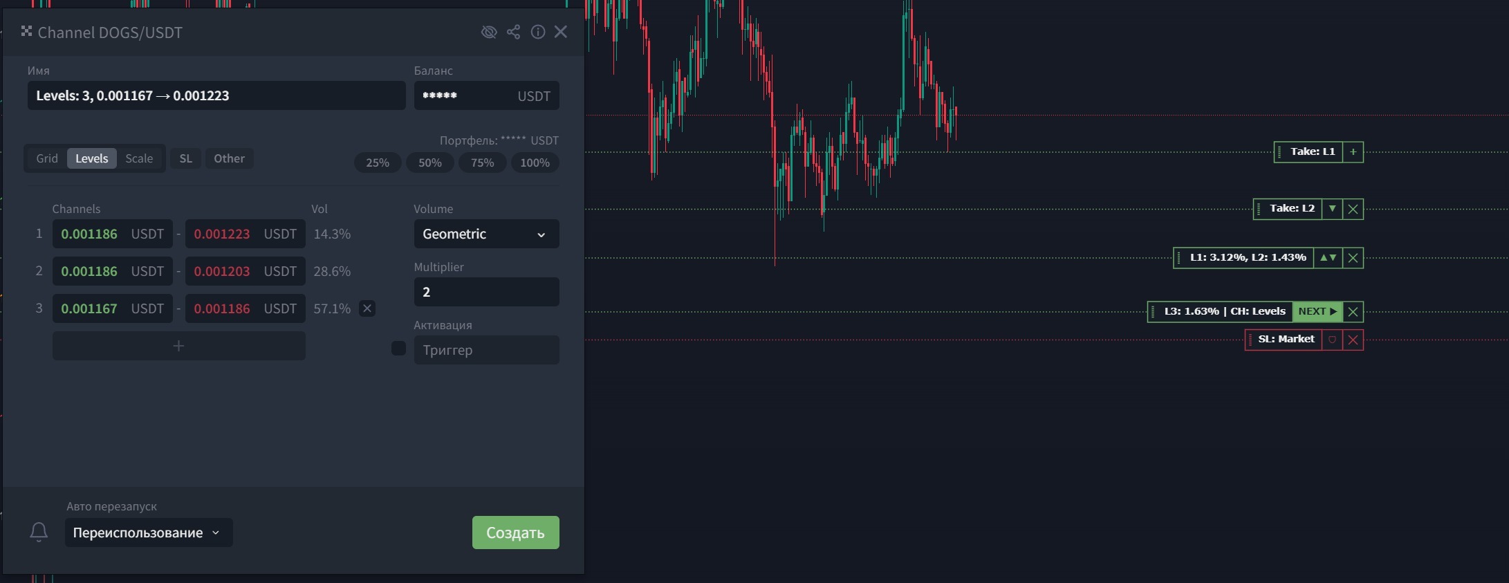 The Channel strategy is launched, and using projections on the chart, the required range for the grid is selected. The steps between limit orders are configured, and automatic order restart is enabled if necessary.