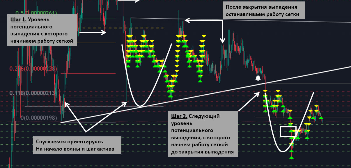 This approach involves processing price drops of up to 50 percent downward or in steps of about 10 points. On the chart, assets are identified that return back after falling below a certain level, which allows trading the closure of such drops. The order grid is distributed across levels and restarted when necessary.