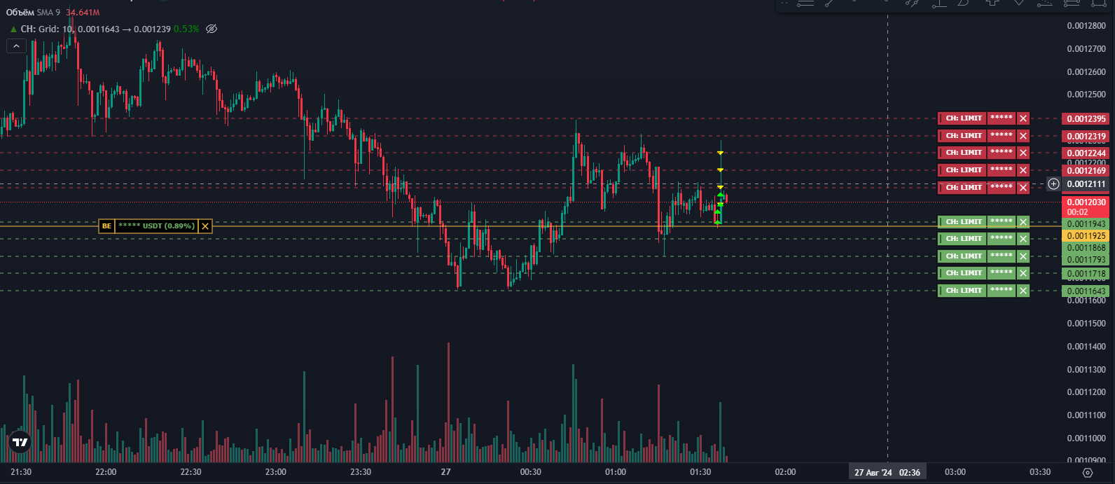 It allows efficient use of strategies based on creating order grids, both before a range is formed (waiting for the asset to enter a potential accumulation zone) and in real time, with the ability to enter at market price and then place a grid of sell orders.