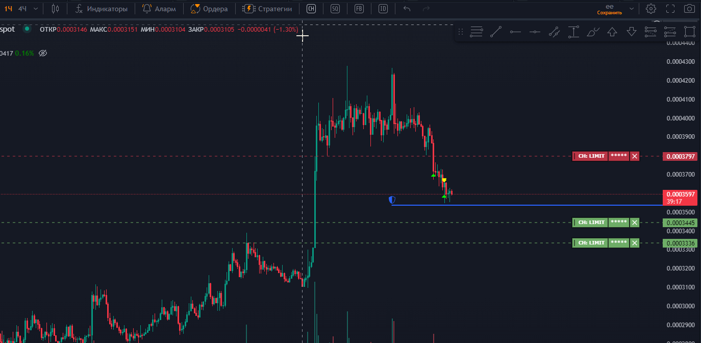 On the chart, an asset is selected for which the order grid should be distributed using the Channel strategy. The level is determined based on the current price and chart history. In the example, the first grid of orders has a step of 3 points, covering the initial wave, while the second grid also has a step of 3 points, covering the beginning of the previous growth wave.