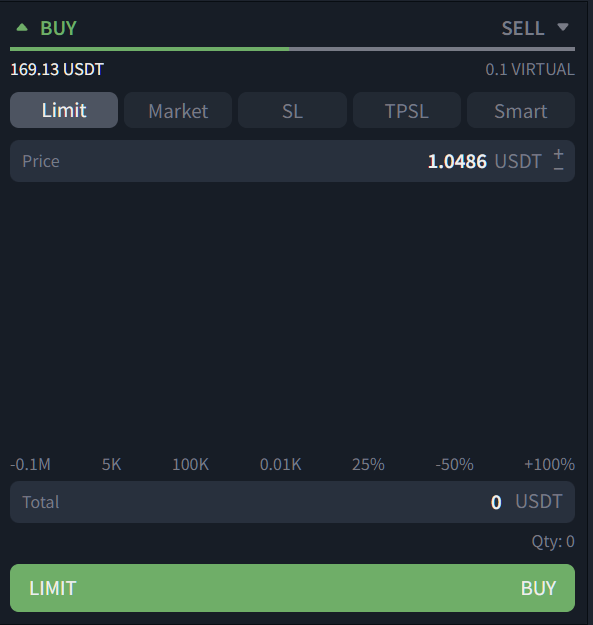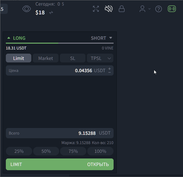 Вкладки типа ордера: быстрый выбор типа заявки — Limit / Market / SL / TPSL.