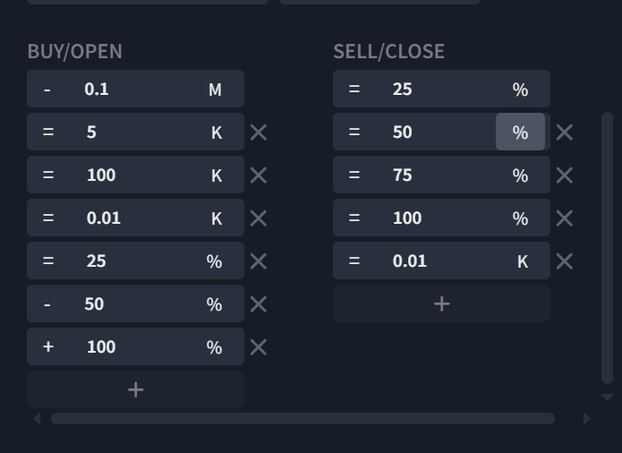 Во время редактирования блока можно нажимать на кнопку "применить" чтобы активировать изменения и если блок находится в поле видимости, то будет сразу видно что изменилось, не выходя их меню настроек.Тип пресетов и суффиксы "%, К, М" и действия "+ / = / –" (для BUY/OPEN и SELL/CLOSE)
