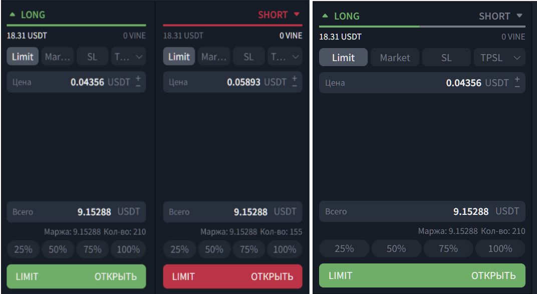 Режим/направление сделки: сверху располагается переключатель BUY/LONG / LONG|SHORT, когда блок в состоянии одиночного окна.