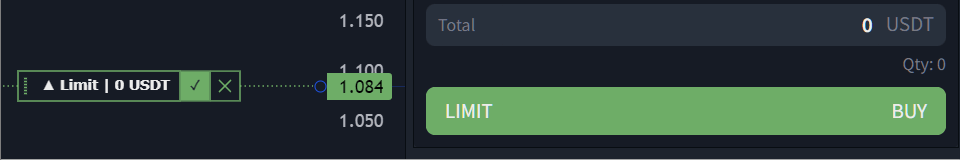 Само слово "цена" кликабельно, клик по слову вызывает проекцию лимитного ордера на графике.- Всего — сумма сделки в валюте котировки (USDT или в торгуемой паре).