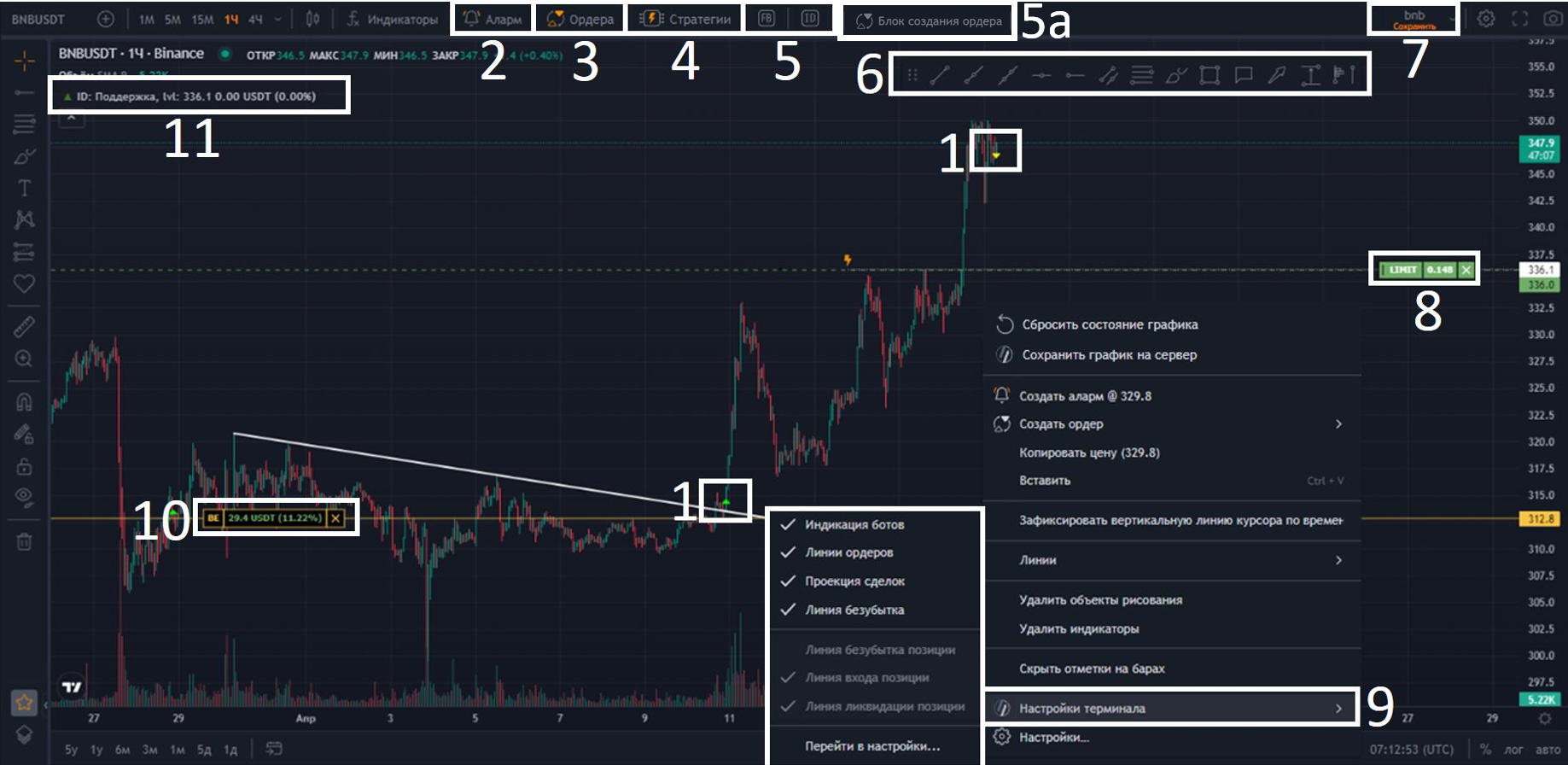 - Линии ордеров - позволяет включить/выключить визуализацию интерактивных заявок (ордеров) на графике